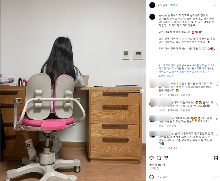 박진희는 13일 인스타그램에 "첫째 아이가 아파트 분리수거장에서 의자를 발견하고 본인이 쓰면 좋겠다고 하는 거에요. 버리면 쓰레기지만, 다시 쓸 수 있는 멀쩡한 의자인데 가져가자고 하더라구요"라며 딸과의 대화를 공개했습니다.