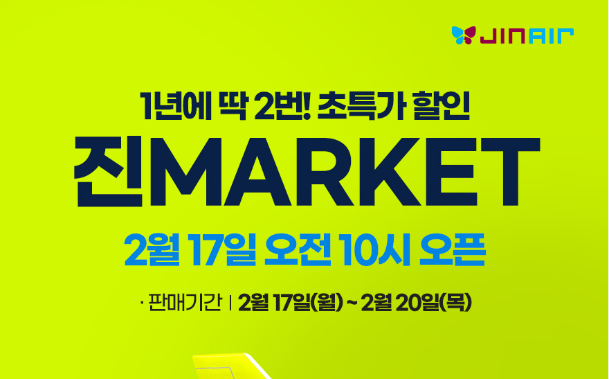 진에어는 오는 17일부터 국제선 36개, 국내선 6개 등 42개 노선 대상으로 진마켓 프로모션을 진행합니다. 진마켓은 상·하반기 각각 1회씩 운영하는 진에어의 대표적 할인 프로모션입니다.