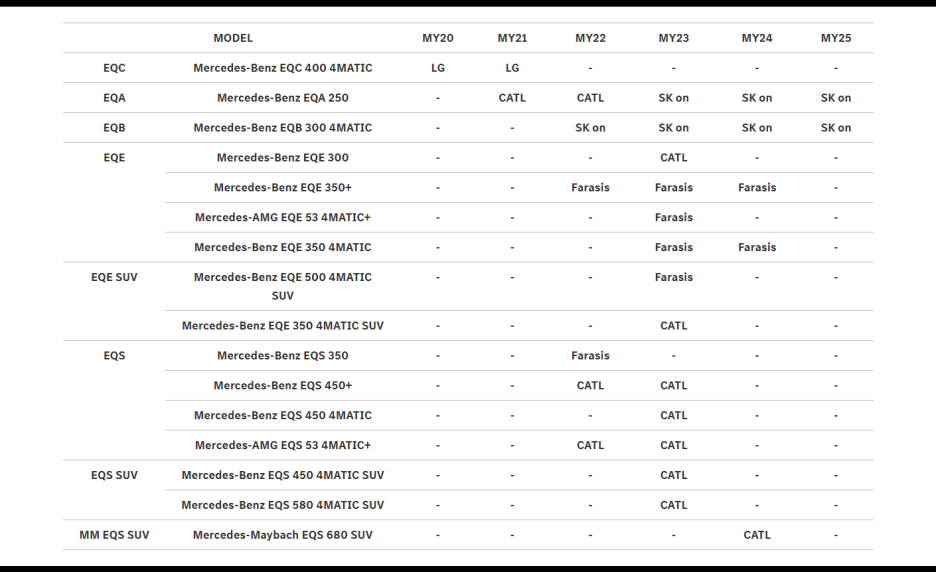 벤츠 EQE 중에선 ‘300′ 트림(세부 모델)만 CATL 배터리. ‘350+’ ‘AMG 53 4M+’ ‘350 4M’에는 파라시스 배터리가 탑재됐습니다. 또, EQS는 ‘350′에는 파라시스 배터리가 탑재됐지만, 나머지 트림에는 CATL 배터리가 탑재됐습니다. EQE SUV에선 ‘500 4M’은 파라시스, ‘350 4M’은 CATL 배터리가 사용됐습니다. 또, EQC는 LG에너지솔루션, EQB는 SK온 배터리만 탑재됐다. EQA는 연식에 따라 CATL와 SK온 배터리가 다르게 탑재됐습니다.