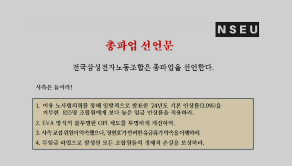 삼성전자 노동조합인 전국삼성전자노동조합(전삼노)이 1일 총파업을 선언했습니다.