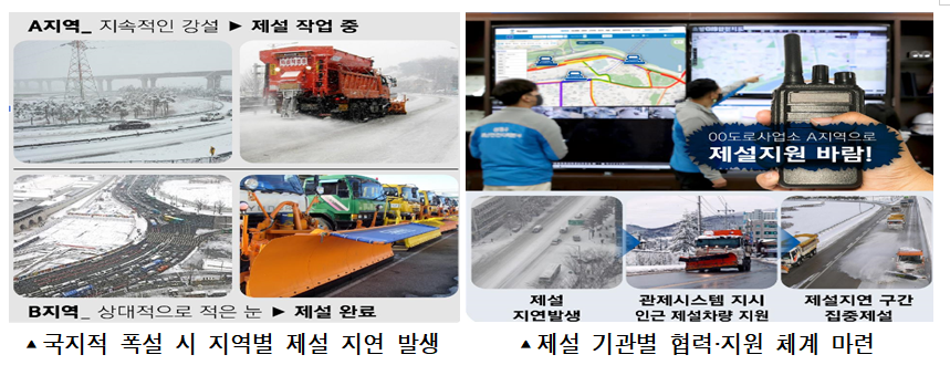 폭설시엔 제설차를 긴급자동차로 등록해 중앙버스전용차로를 타고 작업 장소로 이동할 수 있도록 합니다. 서울에 눈이 내리기 전 제설제 살포를 끝내기 위해 인천 등 서해 지역에 눈이 내리면 제설 장비를 배치하고 제설제를 뿌리기 시작한다고 합니다.