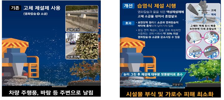 서울시는 액체 염화칼슘에 소금을 섞어 뿌리는 습염식 제설도 확대했다고 합니다. 기존에는 고체 염화칼슘과 소금을 섞어 뿌렸는데, 가루가 날려 다리 이음매 등에 달라붙어 이를 부식시킬 위험이 있었기 때문입니다. 도로에 착 달라붙고, 염화칼슘 사용량도 30% 정도 줄일 수 있었다고 합니다.