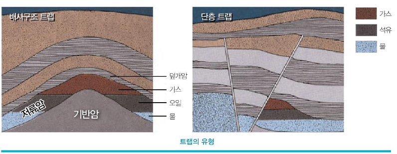 한편 저류암 주변에는 석유가 다른 곳으로 빠져나가지 못하도록 매우 치밀한 암석으로 둘러싸여 있어야 석유가 그 안에 고여 있을 수 있다. 이를 덮개암이라고 한다. 이처럼 석유가 저류암 내에 모이게 할 수 있는 조건을 집유구조 또는 트랩이라 부르는데 자연계에서 트랩구조의 대부분은 배사구조이다. 배사구조는 바가지를 뒤집어 놓은 것으로 연상하면 이해가 빠르다. 트랩을 덮고 있는 덮개암은 균열이 없는 매우 치밀한 암석층이어야 하며, 대표적인 암석으로 셰일이나 이암(泥岩) 등이 이에 해당한다. 이와 같이 유전성립은 여러 조건이 동시에 갖추어져야 하는데 지구상에 이 조건을 구비하고 있는 장소는 한정되기 때문에 석유와 가스의 매장이 지역적으로 편재되어 있는 것이다. 석유는 성질이 물보다 가벼워 암석 내에서 상부로 떠오르려는 성질을 갖는다. 따라서 유전 내에서는 아래로부터 물, 원유, 가스의 순으로 쌓인다.