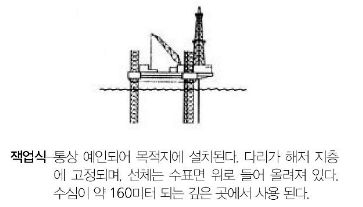 잭업(Jack-up, Rig)식은 통상 예인되어 목적지에 설치된다. 다리가 해저 지층에 고정되며, 상하 이동 가능한 선체는 조업 시 수표면 위로 들어 올려져 사용된다. 수심이 비교적 얕은 지역에서 사용된다. 반잠수식 시추리그는 폰툰(Pontoon)이라 불리는 다리를 가지고 있다. 이 폰툰에 공기를 채워 부양되도록 하고 8개 이상의 닻을 이용하여 위치가 유지되도록 한다. 거칠고 깊은 바다에서 뛰어난 안전성을 제공하는 장점으로 북해 북부 유전과 같이 기상이 나쁜 곳에서 선호된다.