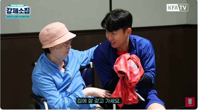 대한민국 축구 국가대표팀 주장 손흥민이 치매를 앓고 있는 열혈 할머니 팬과 감동적인 만남을 가졌다. 손흥민은 루이소체 치매를 앓고 있는 정금남 할머니와 직접 만나, 그녀의 손을 꼭 잡고 안았다. 할머니는 손흥민의 건강을 걱정하며 "왜 이리 말랐나"라고 물었고, 손흥민은 "많이 먹는다"고 안심시켰다.