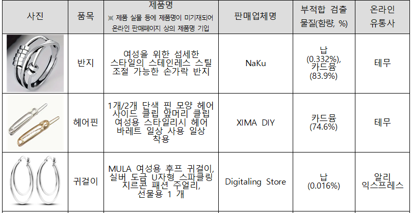 이번에 새로 안전성을 조사한 590개 제품은 △방향제·코팅제 등 생활화학제품 257개 △귀걸이·목걸이 등 금속장신구 283개 △오토바이 브레이크 패드 등 석면함유우려제품 50개로 구성되었습니다. 이중 생활화학제품 40개, 금속장신구 38개, 석면함유제품 8개가 국내 안전기준에 미치지 못했습니다.