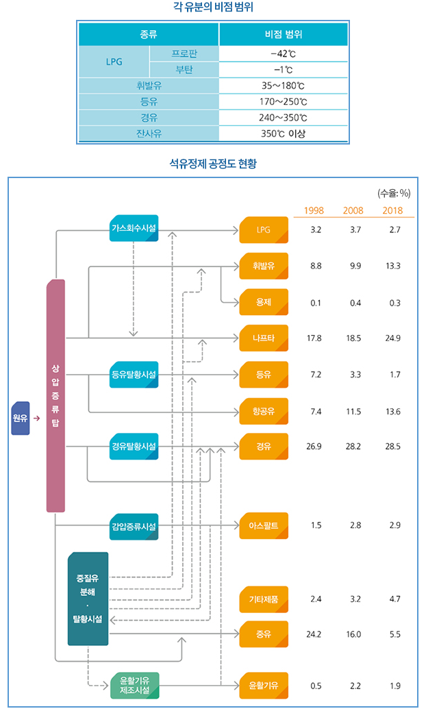 증류탑 상단에서 증기를 냉각 액화하여 다시 하단으로 보내는 것을 환류라고 하며, 이 환류를 통하여 온도를 조절할 수 있고, 정유도(精溜度)를 향상시킬 수 있다. 응축한 액체는 적당한 출구를 가진 칸막이로부터 추출된다. 한편 가열로에서 플래시 존으로 원유가 취입될 때 기화하지 않는 중질유는 하강한다. 그리고 하부의 스팀 구멍에서 취입된 수증기에 의하여 약간의 경질부분을 기화하여 추출한 후 나머지는 탑 아래에서 잔사유로 빼낸다. 상압증류장치에서 분류되는 각 유분의 비점 범위는 명확히 정해진 것은 없으나 대체로 다음과 같다.