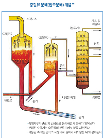 알루미나-실리카를 이용한 촉매 크래킹 방법은 1942년경에 미국에서 처음 실용화되었다. 그 덕분에 미국은 충분한 양의 휘발유와 합성고무를 생산할 수 있게 되어 제2차 세계대전에서 승리할 수 있게 되었다. 최근에는 촉매 성능이 훨씬 뛰어난 제올라이트를 이용하는 방법이 주로 사용된다. 미리 가열한 벙커C유 성분을 600℃ 이상으로 가열한 제올라이트 촉매와 접촉시키면 기체 상태로 증발하면서 휘발유, 경유, LPG 성분으로 분해가 된다. 촉매의 성능을 유지하려면 상당한 수준의 공학적 설계 능력이 필요하다.