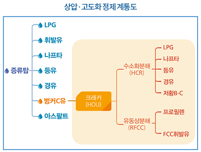 따라서 정유사의 입장에서는 석유정제의 수익성 확보를 위해서 벙커C유 대신에 판매 가격이 높고 소비량도 많은 휘발유와 경유로 전환시키려는 노력이 필요한데, 그러한 목적으로 사용되는 것이 크래킹(Cracking)이라는 공정이다. 크래킹은 벙커C유에 들어 있는 길고 큰 탄화수소 분자들을 크기가 작은 탄화수소로 잘라내는 공정이다.