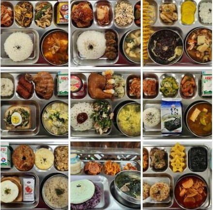 공개한 급식 식판에는 샌드위치, 볶음밥, 회오리감자, 닭다리구이, 자장면, 탕수육 등이 놓여 있다. 식판에는 한눈에 보기에도 먹음직스럽고 예쁘게 음식이 담겨 있습니다..