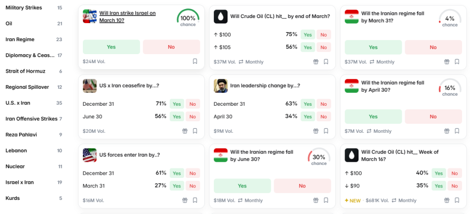 중동 지역의 긴장이 이어지는 가운데 전쟁 자체를 하나의 투자 대상으로 삼는 새로운 현상이 나타나고 있습니다. 미국과 이스라엘, 이란을 둘러싼 군사 충돌이 길어지는 상황에서 전황과 공격 시점, 인명 피해 여부까지 돈을 걸고 예측하는 움직임이 확산되고 있습니다.