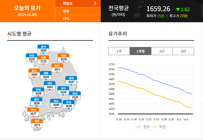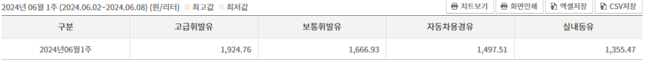한국석유공사 유가정보 서비스 오피넷에 따르면 6월 첫째 주 기준 휘발유,경유의 평균 판매가격은 리터당 1666.93원, 1497.51으로 전주 대비 11.5원, 14.38원 하락했습니다.