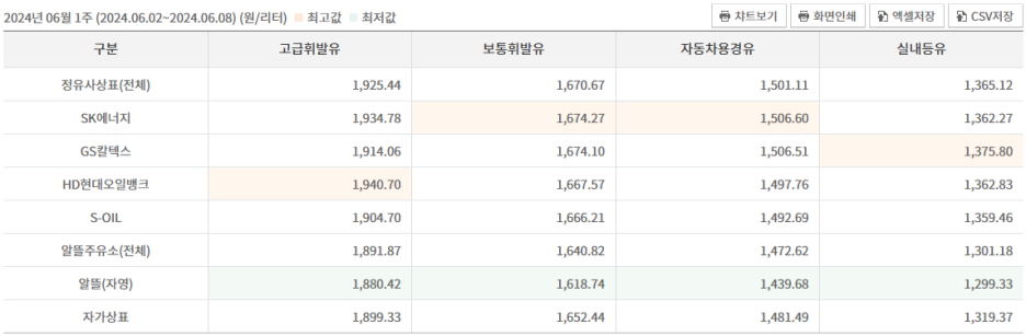 상표별로는 알뜰주유소(자영)가 1618..74원으로 가장 저렴했고, SK주유소가 1674.27원으로 가장 비쌌습니다. 경유도 알뜰주유소(자영)가 리터당 1439.68원으로 전국에서 가장 가격이 낮았고, SK주유소는 1506.6원을 기록했습니다.
