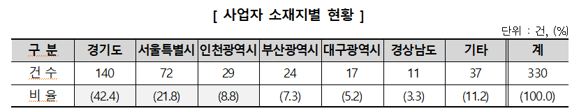 사업자의 소재지별로 살펴보면 ‘경기도’ 42.4%(140건), ‘서울특별시’ 21.8%(72건), ‘인천광역시’ 8.8%(29건) 등 순으로 대형 매매단지가 있는 수도권 소재 사업자가 전체의 73.0%(241건)로 나타났습니다.