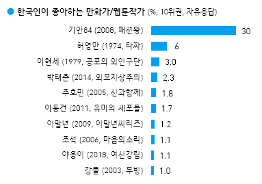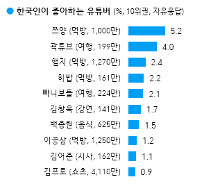이밖에도 좋아하는 만화가/웹툰작가 부문에는 기안84가, 유튜버 부문에선 먹방 유튜버 쯔양이 1위를 차지했습니다.