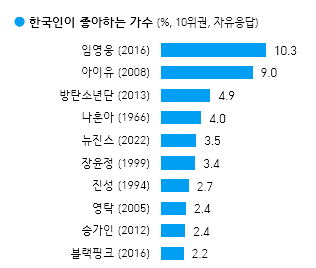 가수 부문에서는 임영웅이 10.3%로 1위를 차지했으며, 그 뒤를 이어 아이유가 9.0%로 2위에 올랐습니다. 또한, 방탄소년단 (4.9%)과 나훈아 (4.0%)도 인기를 끌었습니다. 임영웅은 여성과 중장년층에서 높은 지지를 받았고, 아이유는 남성과 10~30대에서 더 많은 득표율을 기록했습니다.