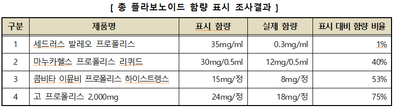 또한 조사대상 40개 중 총 플라보노이드 함량을 표시한 4개 제품은 모두 실제 함량이 표시보다 최소 25%에서 최대 99% 부족했습니다.