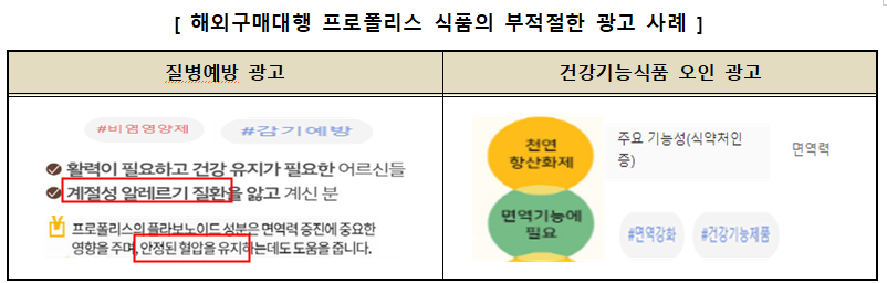해외구매대행 프로폴리스 식품은 국내에서 건강기능식품으로 인정받지 않은 일반 식품입니다. 이에 따라 질병 예방 효과나 건강기능식품으로 오인할 수 있는 광고를 할 수 없습니다. 그러나 조사대상 40개 중 22개 제품이 ‘감기예방’ 등 질병 예방 효과와 ‘면역강화’ 등의 효능에 관해 표현해 건강기능식품으로 인식할 우려가 있는 표시‧광고를 하고 있어 개선이 필요했습니다.