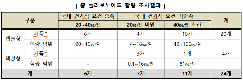 조사대상 40개 제품 중 항산화 기능성을 표시‧광고한 24개 제품에 대해 항산화 기능성 성분인 총 플라보노이드 함량과 표시실태를 확인한 결과, 18개 제품이 우리나라 건강기능식품의 총 플라보노이드 1일 섭취량에 미치지 못하거나 초과했다. 이 중 7개 제품은 총 플라보노이드 함량이 20mg/일 미만이었고, 11개 제품은 40mg/일을 초과해 국내 항산화 기능성 인정요건을 충족하지 못했습니다. 1일 섭취량이 40mg을 초과하는 제품은 장기간 섭취할 경우 간 기능에 무리를 줄 수 있어 소비자의 주의가 필요합니다.