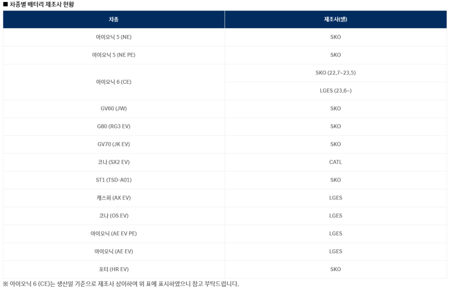 현대 전기차 13종 배터리 제조사 공개