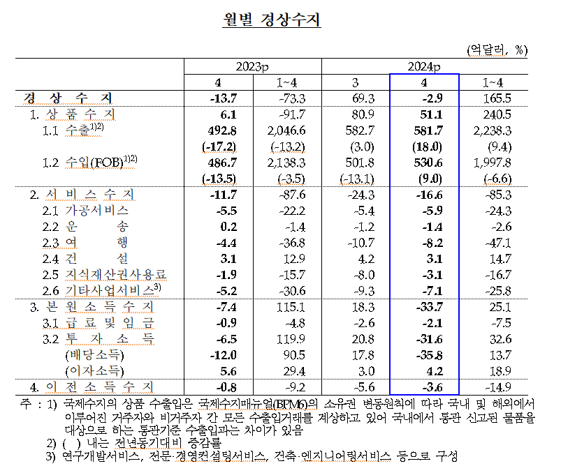 상품수지는 51억1천만 흑자로 작년 4월 이후 13개월 연속 흑자를 기록했으며 , 수출은 지난해 4월보다 18.0%, 수입은 9.0% 증가하였습니다.