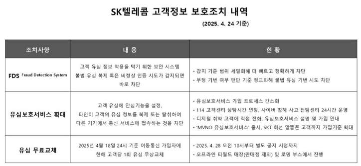 현재 정부 당국과 SK텔레콤은 사건의 정확한 원인과 피해 규모를 파악하고 있습니다. 아직까지는 해커들이 어떠한 추가 공격을 시도했다는 정황도 발견되지 않았습니다. 게다가 통신사는 유심 교체 지원과 함께 유심 보호 서비스를 제공하여, 가입 고객의 유심 정보가 타 단말기에서 사용되지 못하도록 차단하는 조치를 병행하고 있습니다.